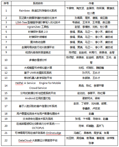 经专家和参会教师投票,梁彬教授主持的“Android应用反重打包技术”荣获特等奖,金琴教授主持的“视频内容自然语言描述”、柴云鹏教授主持的“瓦记录大数据存储的性能优化技术”和范举教授主持的“在线话题感知社交影响力分析系统—— OCTOPUS”这三项课题荣获一等奖,金琴教授主持的“多模态情感分析”,窦志成教授主持的“时事探针系统3.0”与“案件自动定罪”、陈跃国教授主持的“Rainbow: 自适应列存储优化系统”与魏哲巍教授主持的“大规模图节点相似度计算”这五项课题荣获二等奖。
