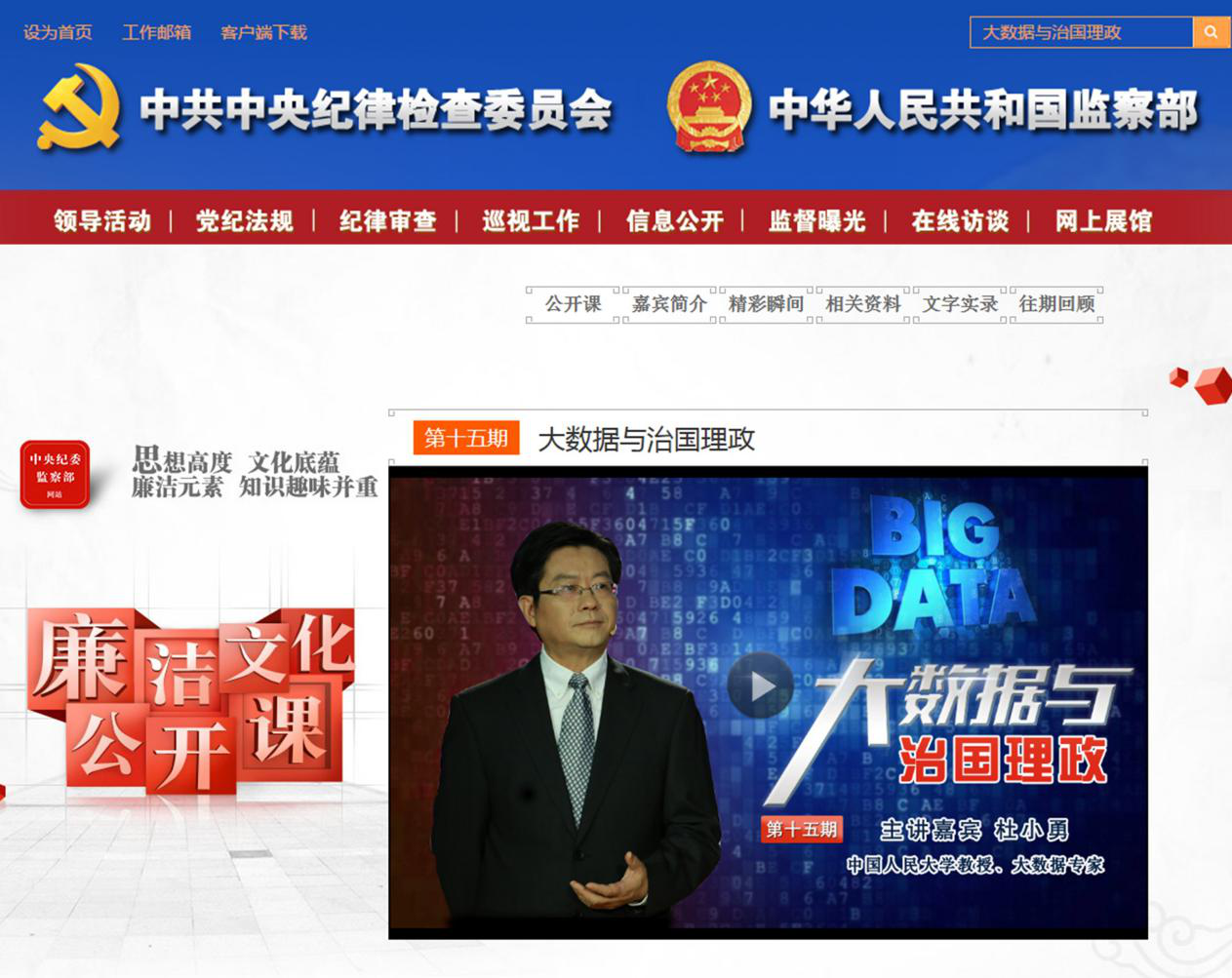 近日,我校理工学科建设处处长、金沙威尼斯欢乐娱人城杜小勇教授应中央纪委邀请,前往讲授《廉洁文化公开课》,以“大数据与治国理政”为题,讲述了大数据作为有效处理复杂社会问题的新手段,开辟了提升治国理政能力的新途径,该课程视频已在中纪委网站登载。