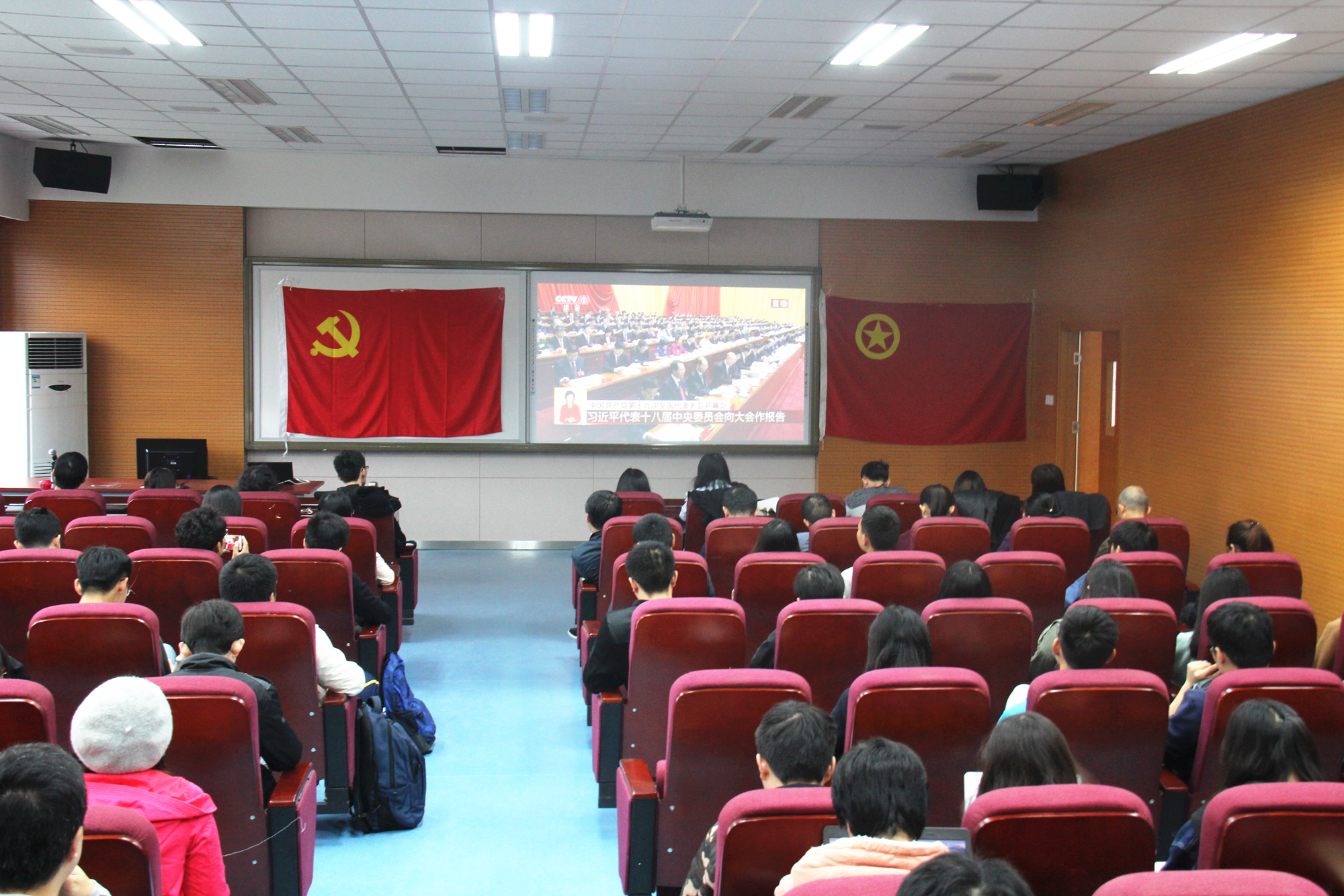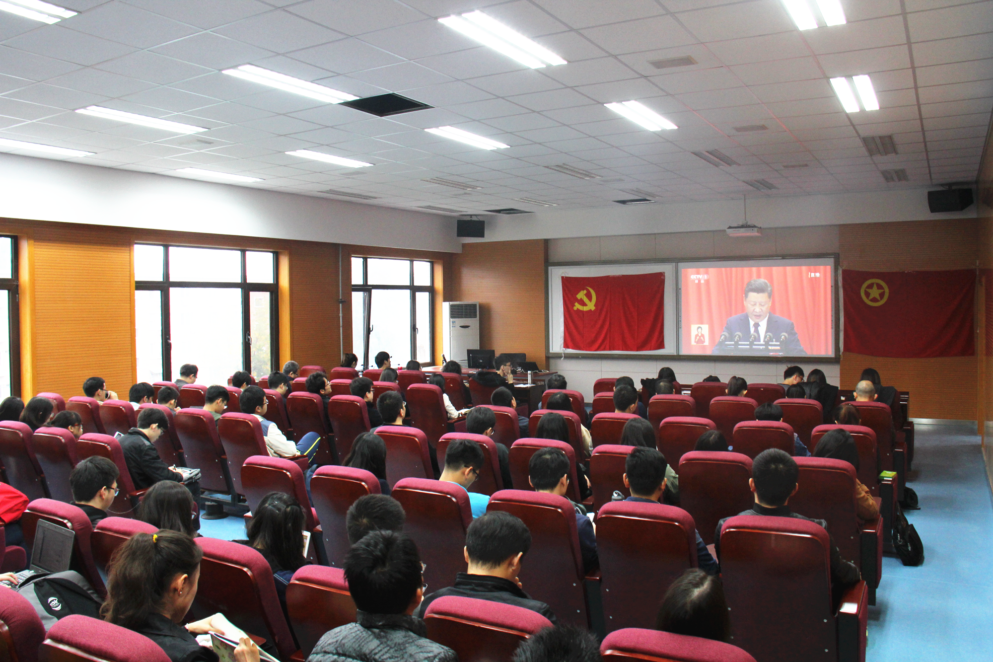 2017年10月18日,中国共产党十九次全国代表大会在北京人民大会堂召开。上午九点整,金沙威尼斯党委、师生党员、团学系统骨干在信息楼四层报告厅集体收看开幕式直播。